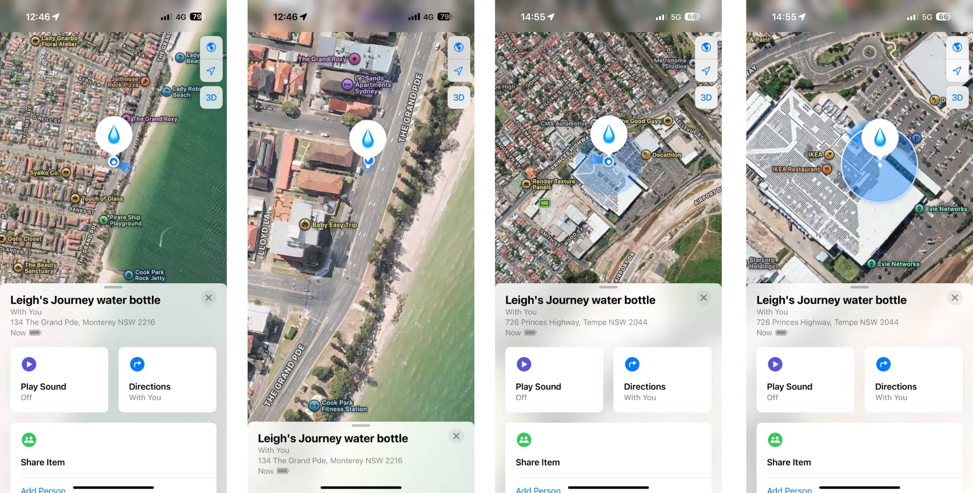 Testing support for Apple Find My in a soccer field found the drink bottle immediately, as we did when we travelled with the drink bottle.