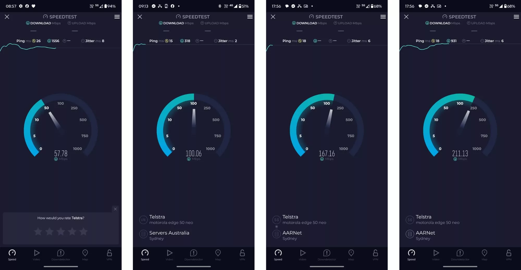 In the Edge 50 Neo, the 5G performance we found meant speeds as high as 211Mbps when testing on the Telstra 5G network by way of Mate in Sydney, Australia.