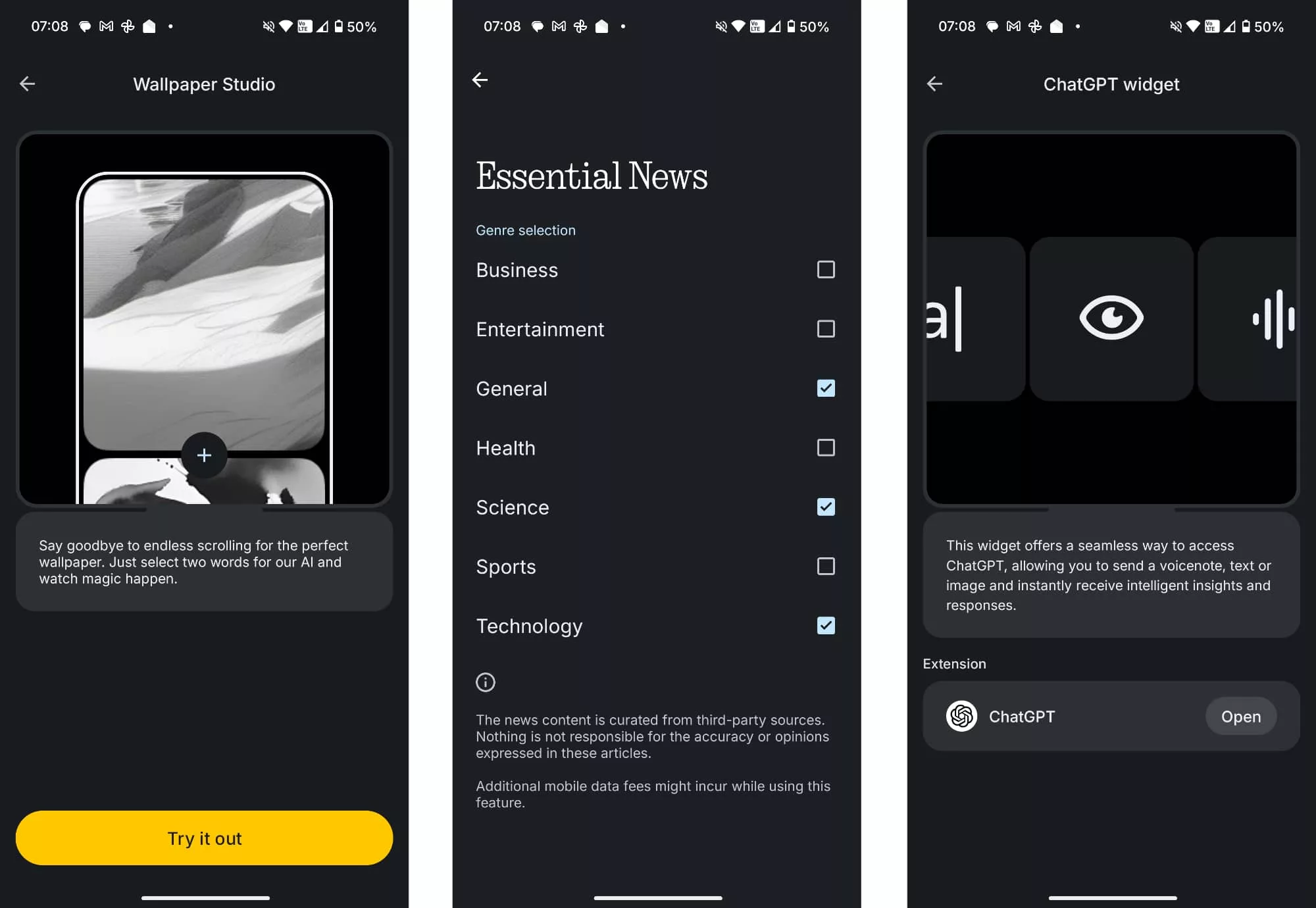For Nothing, that includes an AI wallpaper generator and support for Nothing’s “Essential Space” journal system, which basically uses a combination of screenshots, voice recording, and AI analysis to understand what you’re doing, drawing your attention to it later. That’s interesting if you use it, and there’s even a dedicated button on the side of the phone to trigger it.