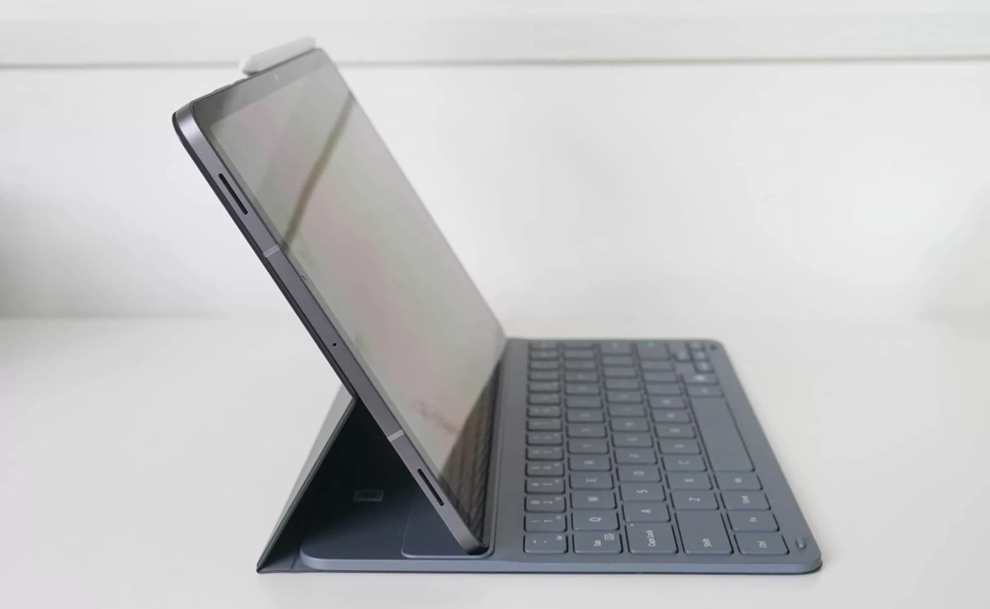 The whole thing feels lighter than it probably should, lacking any heft, but it’s comfortable to use at times, and even magnetically clips to one of the sides easily. Nudge it slightly and it will fall off, but there’s also a magnet at the back for cases, and weirdly, that will also hold the S-Pen.