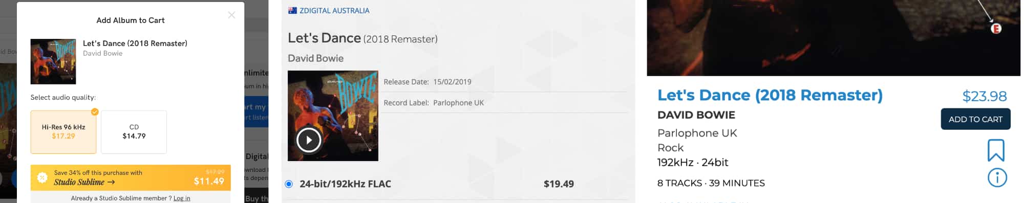 David Bowie’s “Let’s Dance” offers a 192kHz version of HDTracks for $23.98 USD (right) which Zdigital also offers for $19.49 AUD (middle), but Qobuz can’t match it. Rather, the local release from Qobuz is $17.49 AUD (left) and maxes out at 96kHz, it seems.
