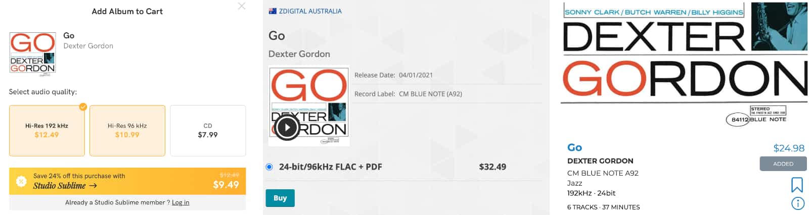 Next is Dexter Gordon, and again, we’re looking at the 192kHz version, which Zdigital doesn’t offer. Instead, it offers a 96kHz version for $32.49 AUD (middle), while HDTracks sells the same for $24.98 USD (right) and Qobuz beats both with the 192kHz for $13.49 AUD (left).