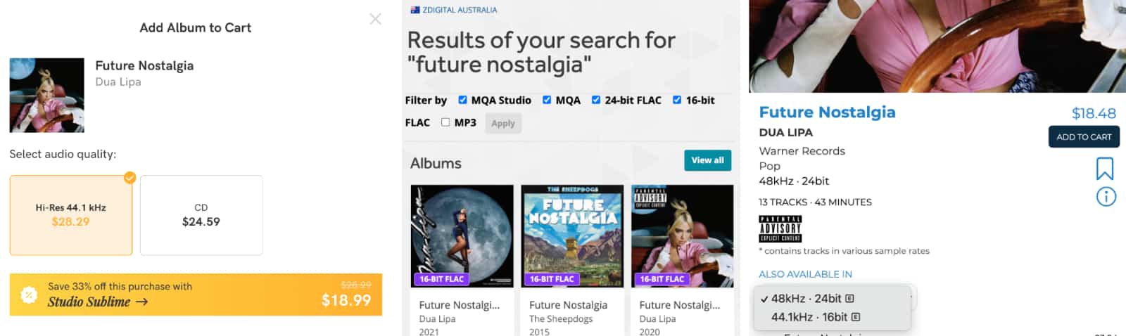 Dua Lipa shows a 48kHz 24-bit release in the US over at HDTracks for $18.48 USD (right), while Qobuz shows a high-res 44.1kHz — which we don’t think is that high for a less impressive $28.29 AUD (left). And over at Zdigital, it has no idea what a 24-bit release for Dua Lipa’s “Future Nostalgia” (middle).