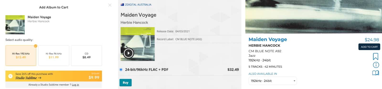 With Herbie Hancock’s “Maiden Voyage”, we’re ideally looking for the 24-bit 192kHz version, which Qobuz offers for $12.49 in Australia (left) and HDTracks has for $24.98 USD (right). In the middle, Zdigital offers the 96kHz version for $32.49 AUD. Qobuz wins this round, and offers a discount for Sublime subscribers.