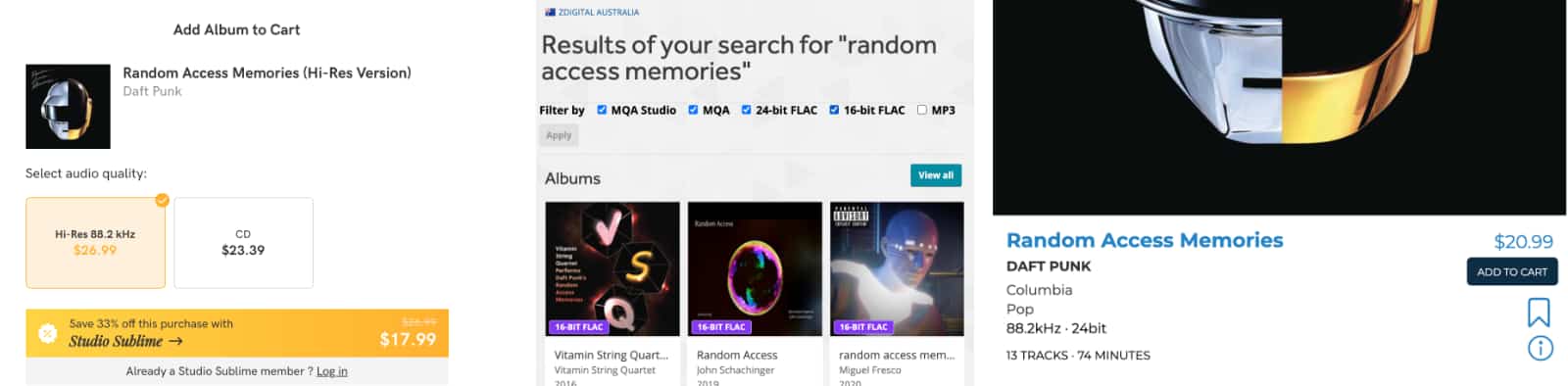 Daft Punk’s “Random Access Memories” isn’t exactly a new record, but it’s one of the few Daft Punk titles available in high-res, focusing on 88.2kHz. HDTracks offers it for $20.99 USD (right), while Qobuz is fairly evenly matched at an Australian conversion rate for $26.99 AUD (left).